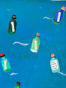 Chaque élève a ensuite choisi un mot qui lui plaisait particulièrement. Il l’a ensuite recopié sur une bouteille en papier, puis décoré à sa manière : couleurs, motifs, collages…
